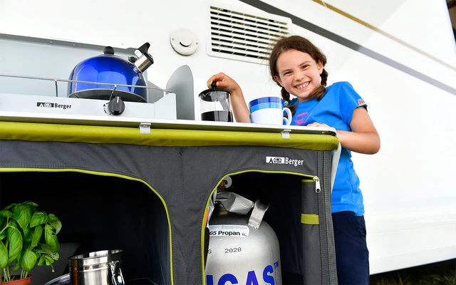 Los compartimentos de almacenamiento pueden abrirse mediante la cremallera integrada, de modo que también pueden guardarse artículos más grandes (por ejemplo, la botella de gas). La caja de la cocina tiene una encimera de aluminio enrollable con un revestimiento de lámina limpiable bajo la encimera.