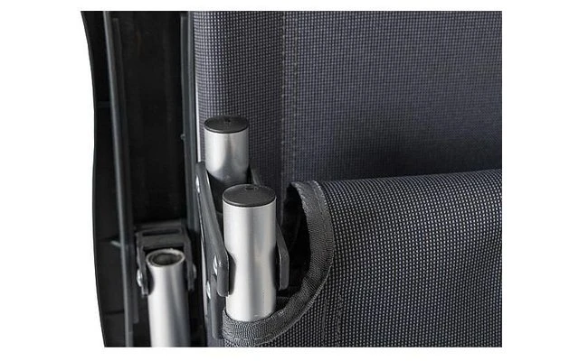 Una tumbona con respaldo ajustable. El respaldo de esta tumbona es ajustable en 5 posiciones. También tiene un marco de acero y un cómodo acolchado de poliéster de 600 deniers. Se pliega de forma compacta después de su uso y se transporta fácilmente con las correas de transporte.