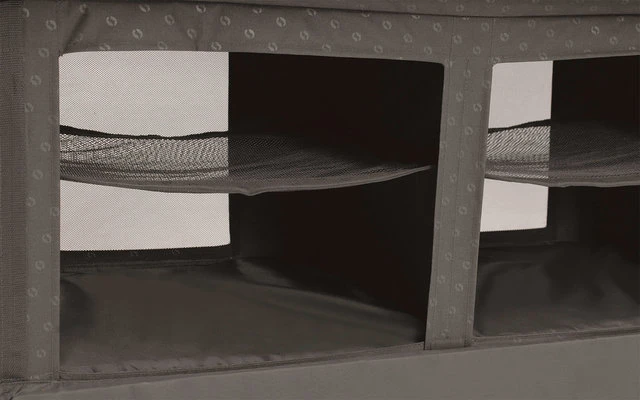 El armario de camping plegable Aruba en gris con 4 compartimentos de almacenamiento y 2 compartimentos de red es ideal para guardar los accesorios de camping. La robusta puerta abatible con asa ofrece un espacio de almacenamiento fácil de usar, como en casa. La puerta está equipada con un cierre magenta. En el lateral también hay un práctico organizador y un gancho para colgar cosas. El armario de camping puede utilizarse solo o junto con el organizador Neat´n´ Tidy. Bolsa de transporte incluida para facilitar el almacenamiento y el transporte.